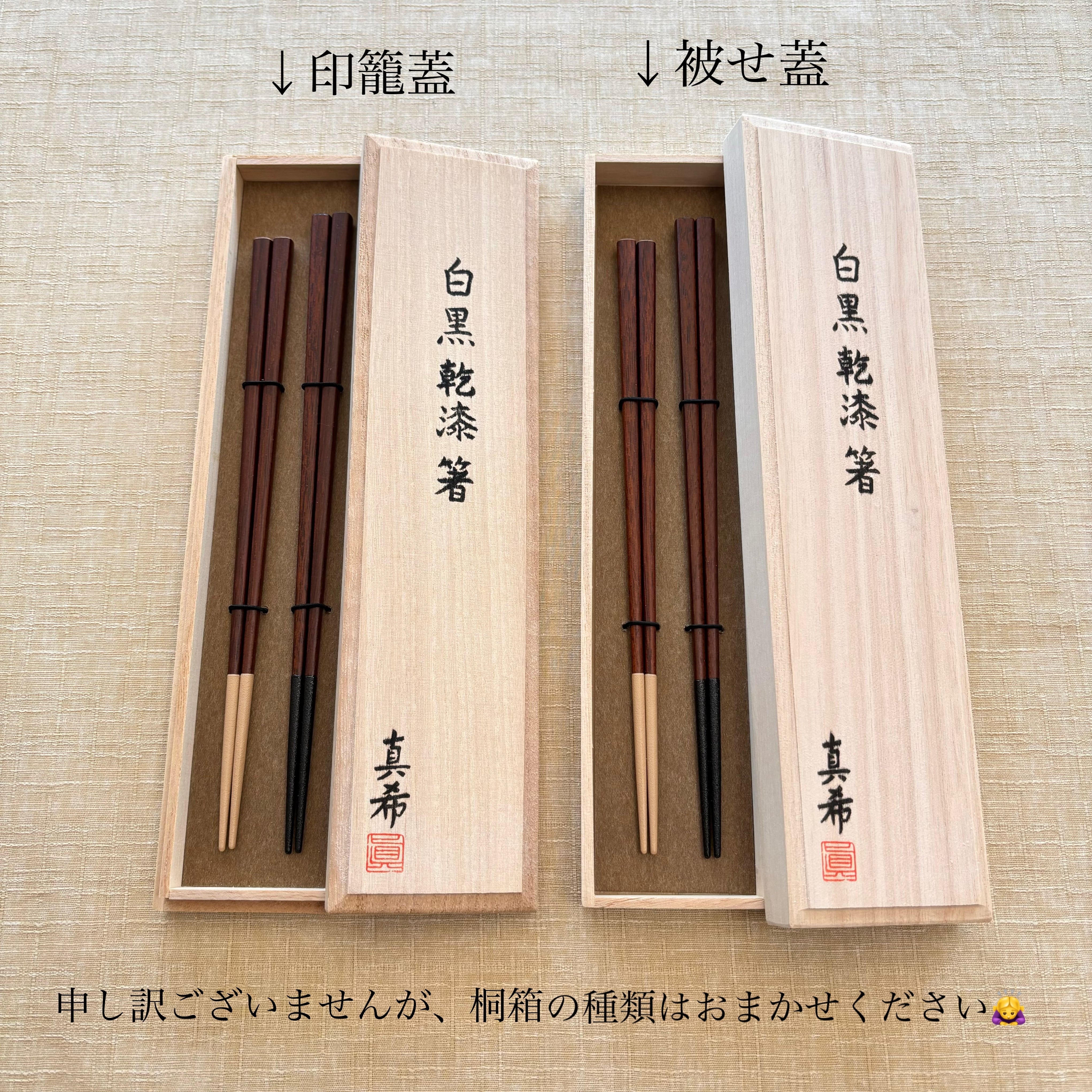 ナチュラルに拭き漆で仕上げたお箸の箸先を黒の漆と白の漆で塗り分けた、シンプルで使いやすいデザインのお箸です。