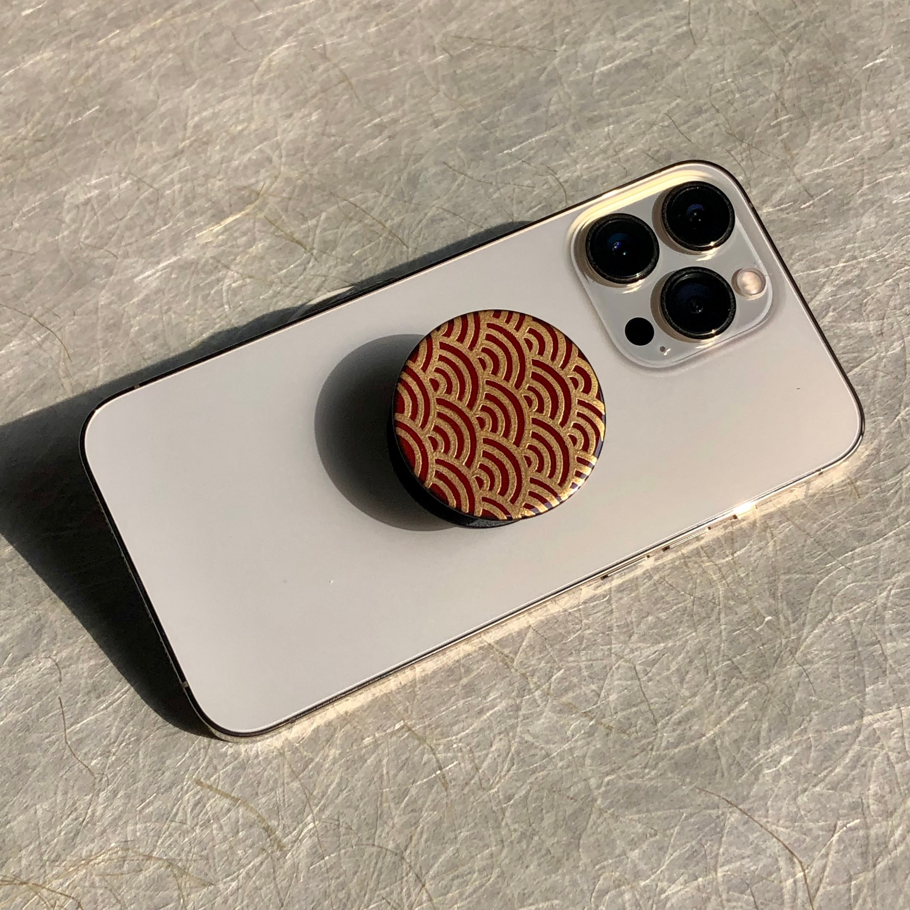 そのポップソケッツに漆塗りを施して、更に【青海波文様】を蒔絵技法にて描きました。